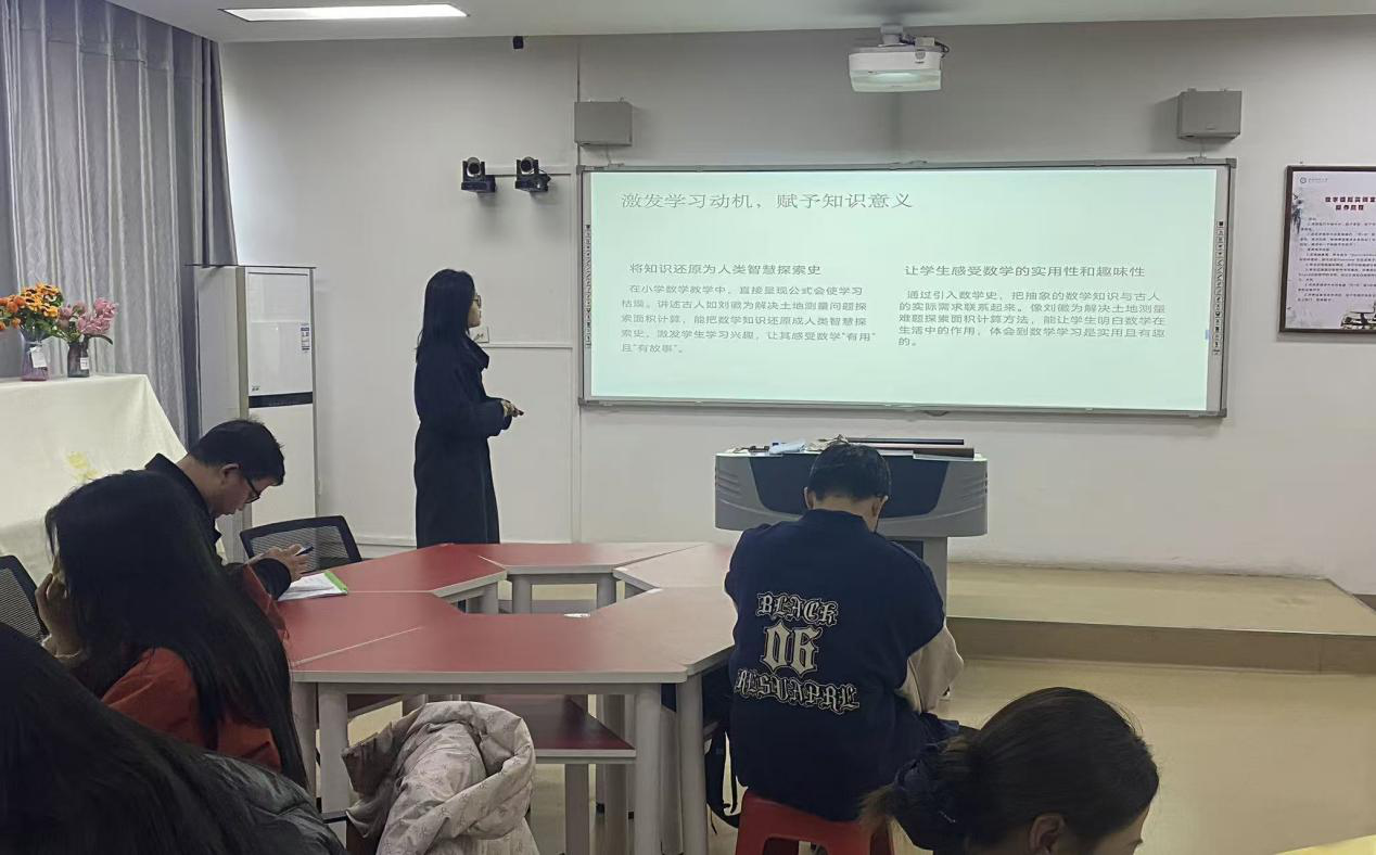 报告会以《HPM:数学史与数学教育》为理论依托,围绕HPM理念在小学数学教育中的应用展开深入探讨。刘建新首先作“数学史在小学数学教育中的应用”专题报告,从HPM视角出发,搭建起理论联系实践的桥梁。随后,各小组围绕HPM理念,结合具体小学数学教学内容,分享读书感悟并展示教学设计成果。最后,刘博士对各小组汇报进行点评,并再次强调数学史的教育价值,引导学生积极探索其在小学数学教学中的融合方法。
