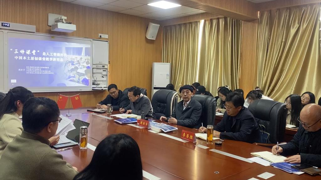 讲座伊始,李文田代表学院对周教授的到来表示热烈欢迎,并简要介绍了周教授的基本情况。讲座中,周教授系统介绍了从陶行知教育思想到“三师课堂”百年传承的思想根脉,详细阐释了“三师课堂”核心载体与运行机制的形态创新,明确指出了“三师课堂”赓续传统之脉、破解当下之困、适应未来之变的价值意蕴,前瞻展望了“三师课堂“育人为本、技术向善、人智协同、共生共创的未来前景。关于”三师课堂“的理论构建与实践探索,周教授特别强调”三师课堂“中教师、小先生、AI智能师通过功能互补与协同联动,构建“人主机辅、技术赋能、情感联结”的良性教育生态,不仅有助于发挥技术赋能教育的功效,更能凸显学生在教学过程中的主体性、能动性,填补技术在人文关怀层面的天然短板。在塑造课堂未来样态的同时,为全球教育在技术浪潮中如何保持育人本色提供了中国实践方案。
