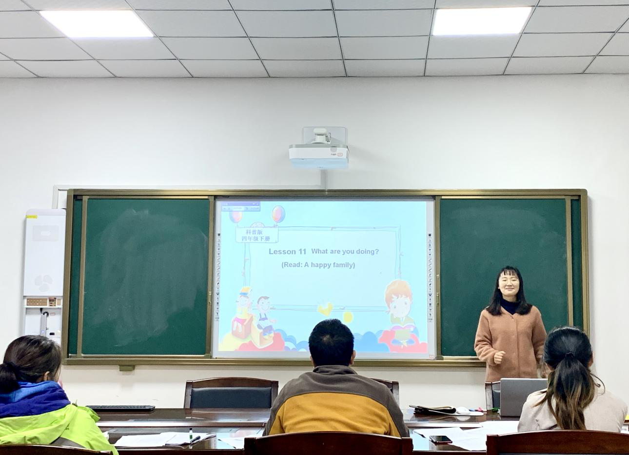 兰祎同学的说课讲课内容为小学科普版四年级下册英语Lesson 11 What are you doing?该同学以阅读“A happy family”小故事为导入,结合提问巩固故事内容,气氛活跃,圆满完成教学目标。
