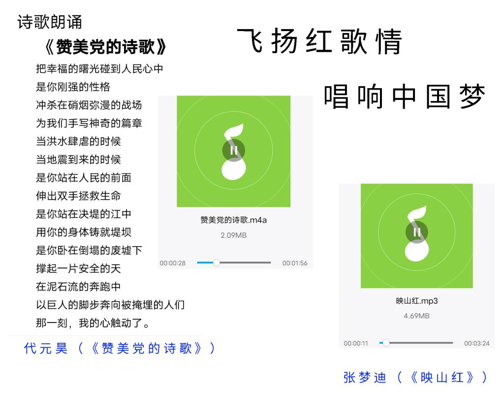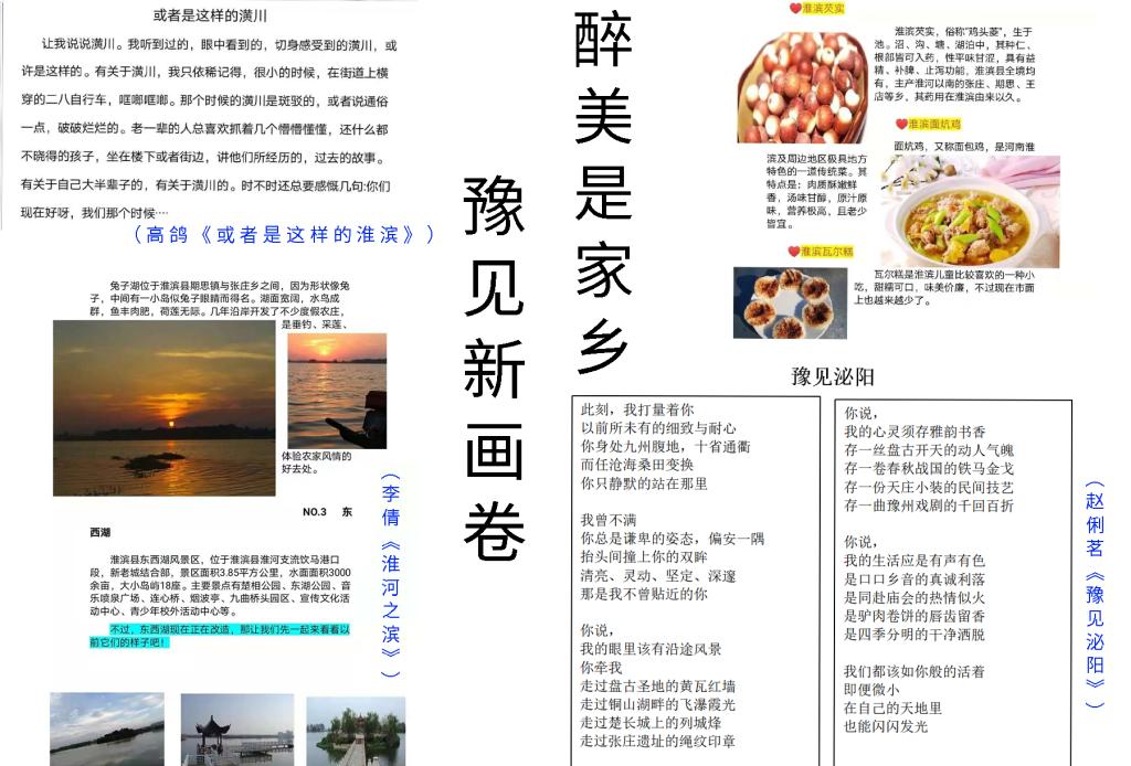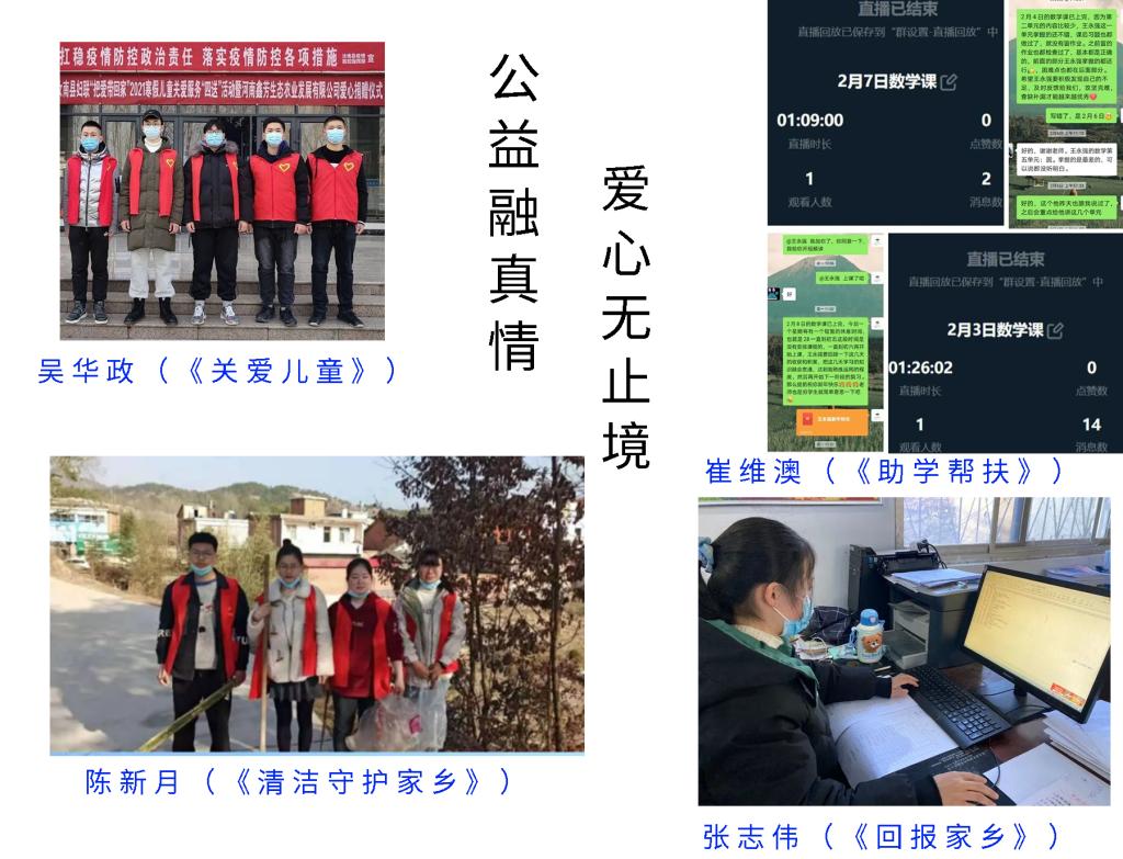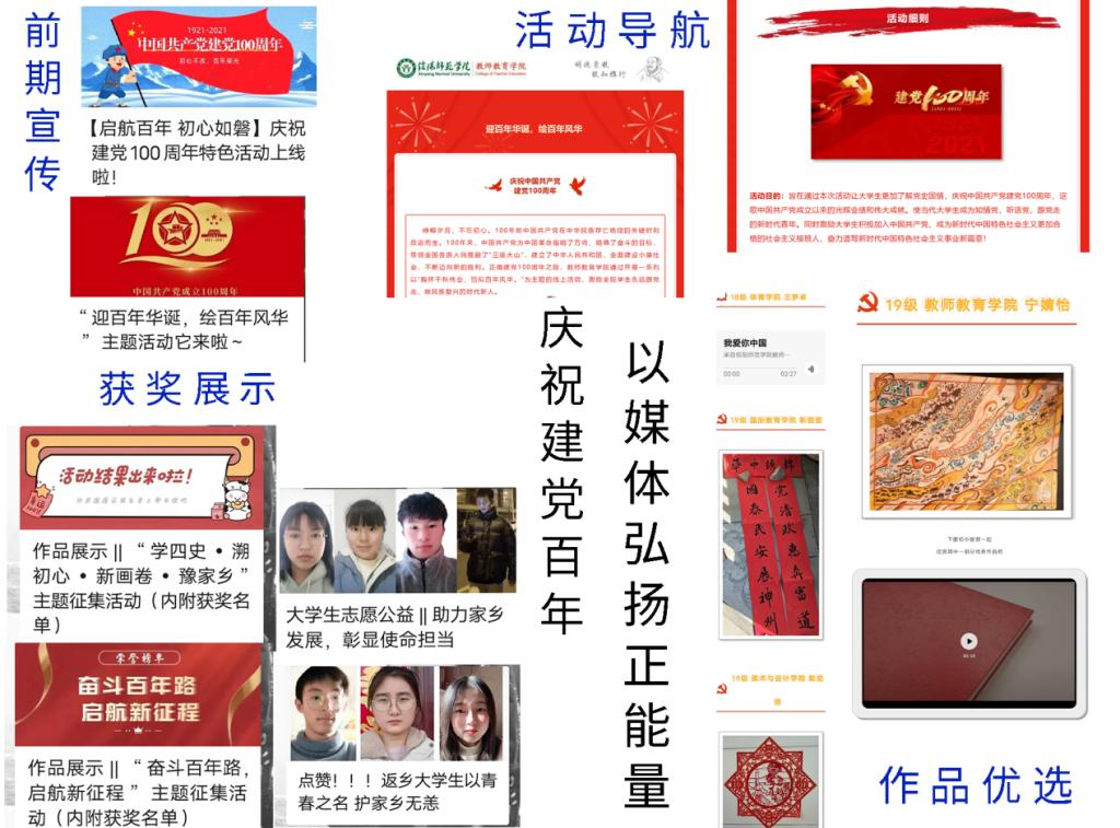 活动包括“奋斗百年路,启航新征程”、“飞扬红歌情,唱响中国梦”、“豫见新画卷,醉美是家乡”主题征集、“青年学四史,逐梦诉初心”抖音宣讲和“‘青’心聚力,基层有我”志愿公益活动五大板块。活动分别围绕回顾党奋斗的百年征程、用生动广泛的歌咏向经典致敬、以家乡的变化展示中国的发展、在学习“四史”中传达内心感悟,以及用实际行动诠释勇于担当的精神五个方面开展。线上参赛作品紧扣主题,依托专业特色,涵盖了文章、诗歌、歌曲、绘画、剪纸、等多种形式,特色鲜明、精彩纷呈。其中,美术与设计学院乾奕扬结合党徽、文字、祥云等元素,以一张别出心裁的剪纸向建党100周年献礼;张梦迪以一曲悠扬的《映山红》传达对红军的热爱与崇敬。陈新月在参与线下清洁家乡志愿公益活动后谈到,从泥泞小道到大路通村,深刻体会到了脱贫攻坚带给家乡人民的幸福感。