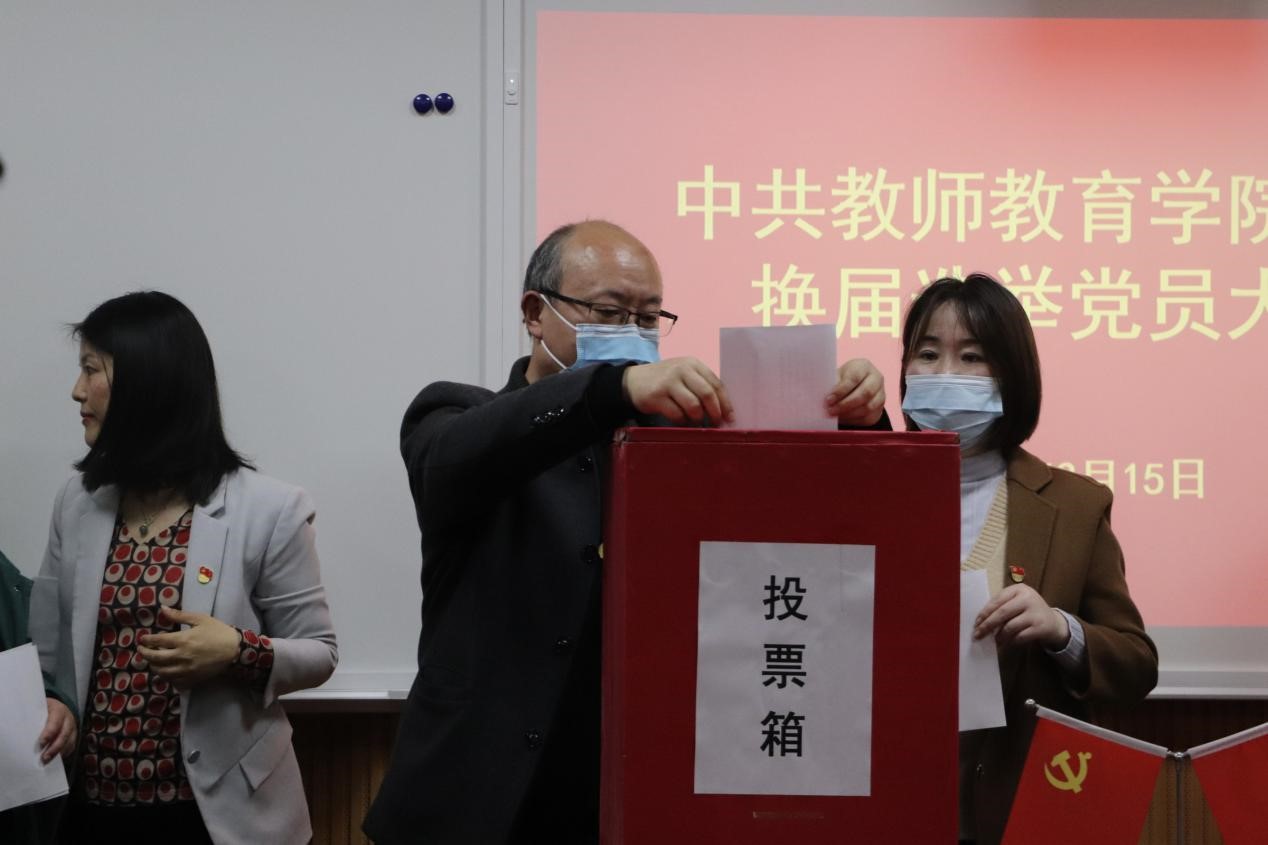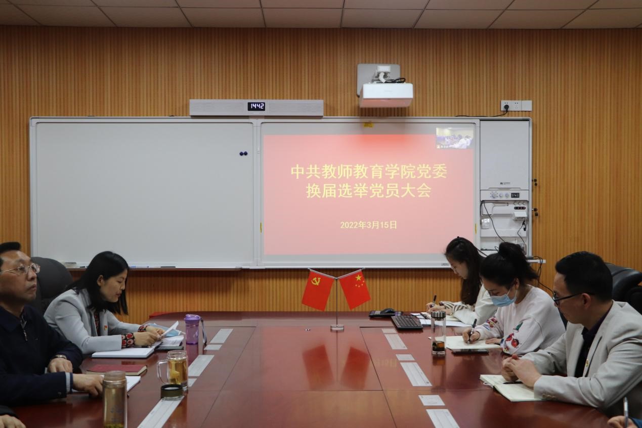 大会在庄严的国歌中拉开帷幕。大会伊始,主持人王艳蕊介绍了学院师生党员人数比例,随后,上一届党委书记潘登围绕加强党的政治建设、加强基层组织建设、坚持立德树人、加强内涵建设四个方面代表学院党委作工作报告,他充分肯定了学院取得的发展成果,提出了问题和不足,表达了对下一阶段工作的期望。他号召以此次换届选举党员大会为契机,秉承“明德崇教,致知雅行”的院训,务实重干,为学院发展再上新台阶、迈上新水平而努力奋斗,为学校建设高水平师范大学贡献力量,以优异的成绩喜迎党的二十大胜利召开。经审议,与会党员一致举手表决通过了上一届党委工作报告。