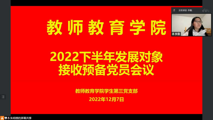 为进一步加强和推进学校基层党组织建设,发挥党组织的核心作用,为党支部注入新鲜血液,beat365中文官方网站第三党支部于12月7日晚在腾讯会议召开2022下半年发展对象接收预备党员会议。本次会议由支部书记徐亚南老师主持召开,其中应到正式党员21名,实到21名。