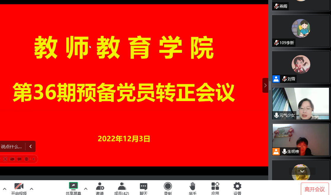 12月3日晚,beat365中文官方网站在腾讯会议举办第36期预备党员转正会议。会议由徐亚南老师主持,党委副书记王艳蕊、第36期全体预备党员、部分党员参加此次会议。