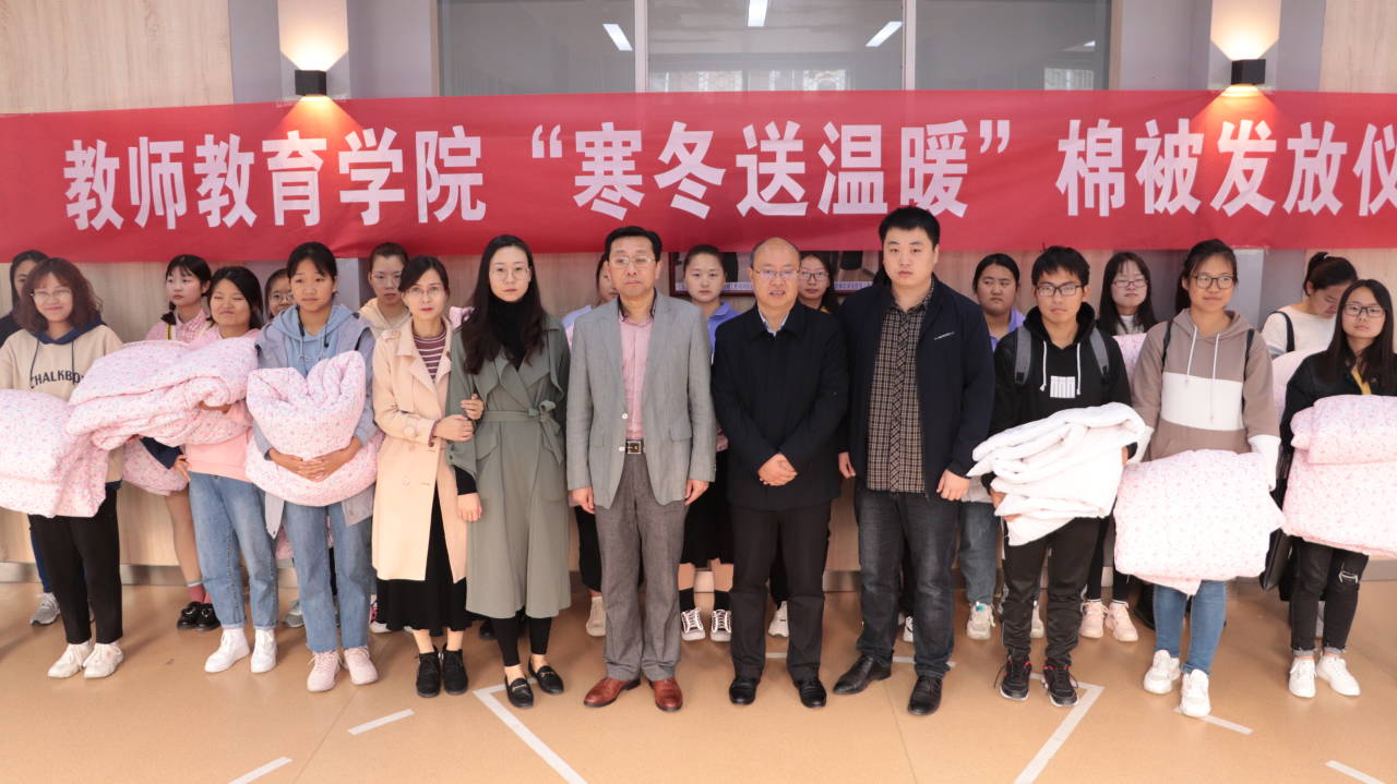为进一步深入“不忘初心、牢记使命”主题教育,帮助学子温暖过冬,11月14日,beat365官网“不忘初心、牢记使命”主题教育2019年“寒冬送温暖”系列活动在教七楼104教室举行。beat365官网党委副书记潘登、党委委员李文田出席了仪式,辅导员李依、郑亚丽、刘莅原及25名受助学生代表参加了爱心棉被发放仪式。