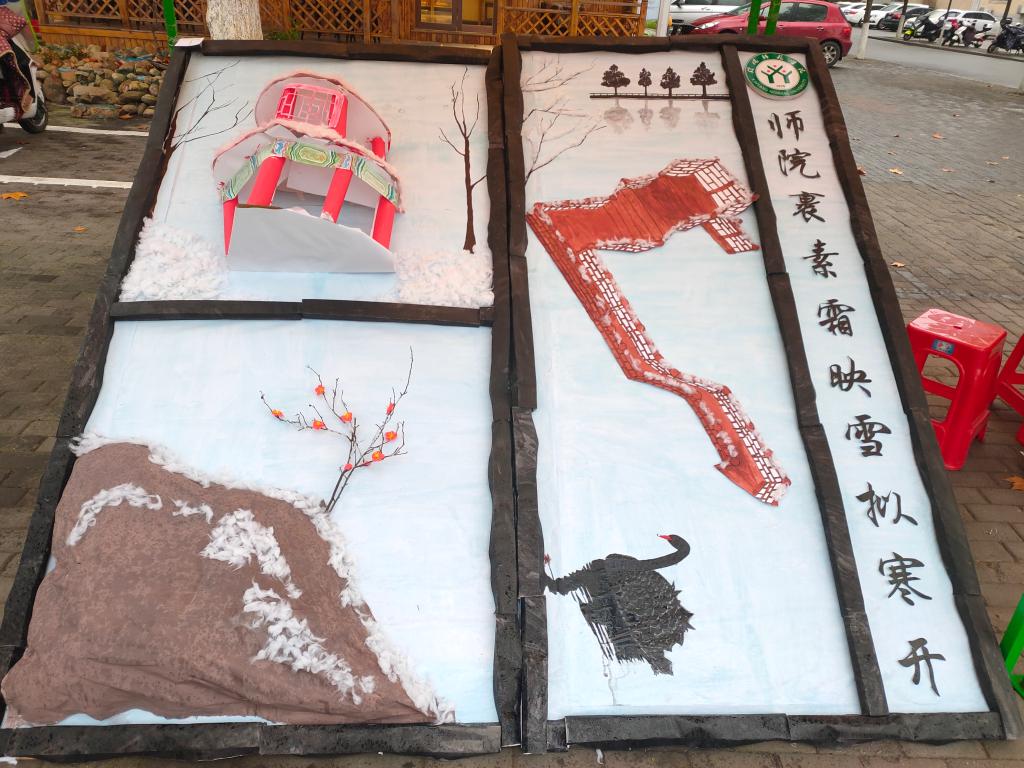 各院系展板作品内容丰富,以日常生活中的材料为设计工具,结合剪纸、绘画、彩叶粘贴等多种艺术形式,融人文性、创造性、环保性为一体,充分展现师院的冬日美景,彰显师院学子积极向上的精神风貌。其中,beat365中文官方网站展板以纸张做亭、棉花为雪、水彩着色,形象的展现了文心亭和半亩塘的美丽雪景;历史文化学院展板利用落叶粘贴、水彩上色,呈现出一幅红叶、半亩塘与体育馆相得映彰的静谧雪景图;美术与设计学院展板则以粉笔为绘画工具,展板内容与师院雪景完美结合,勾起学子对师院冬天美景的美好回忆。