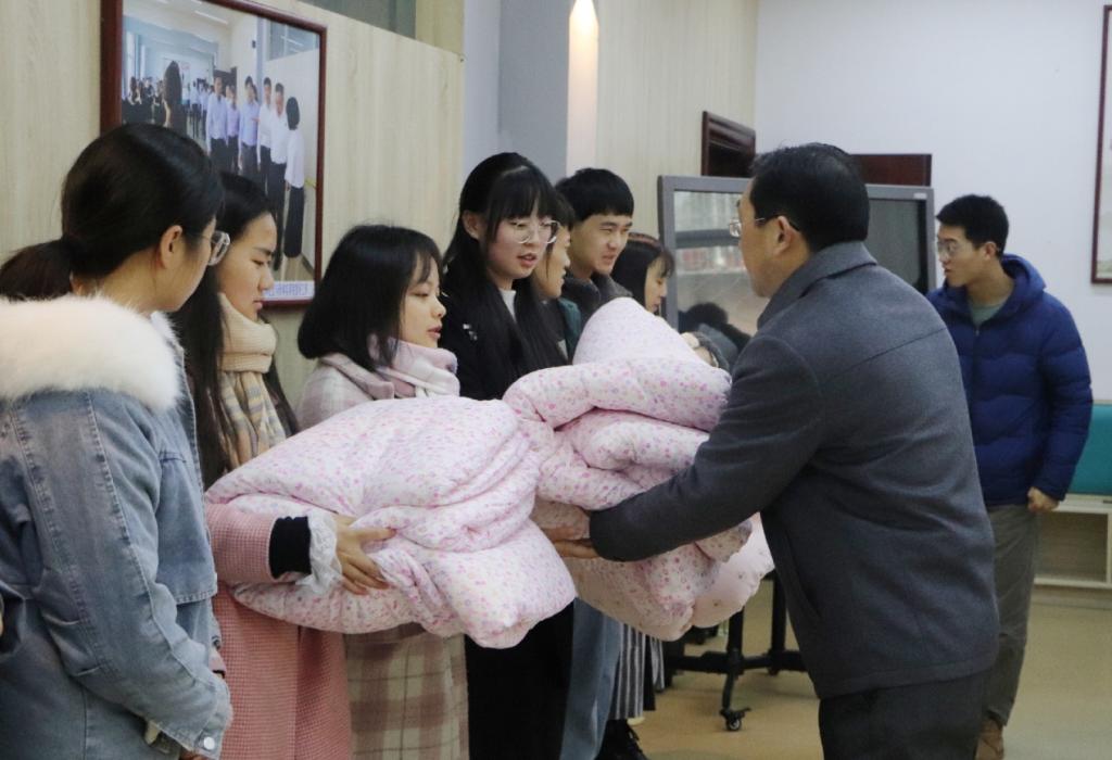 仪式上,潘登向受助学生介绍了开展本次活动的目的和意义,表明学院在新形势下切实解决学生困难,以送棉被、送温暖的方式践行初心与使命。同时,他围绕生活、学习和自身发展三个方面向受助学生提出三点期望。一是勇于面对挑战,在解决困难的过程中磨练自身意志;二是心怀感恩,认真学习科学文化知识,发挥自身优势,用实际行动传递温暖、回报社会;三是努力奋斗,坚定理想信念,在大学四年的时间里提升综合素质,成为一名优秀的小学教育全科教师。随后,潘登带领各位老师发放了被褥,受助学生纷纷表示感谢,并表示要将爱心化为动力,努力学习,不断进步。
