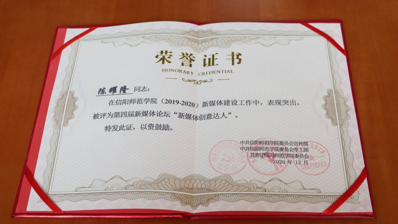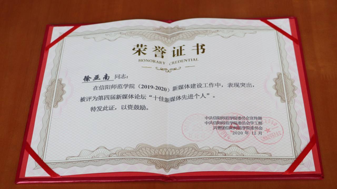 12月19日,信阳师范学院第四届新媒体论坛暨颁奖典礼在逸夫楼321会议室顺利举行,beat365官网在本次颁奖典礼上收获颇丰。本院融媒体工作室荣获“十佳新媒体单位”奖项、指导老师徐亚南荣获“先进个人”称号、融媒体工作室主任陈耀隆荣获“创意达人”称号。