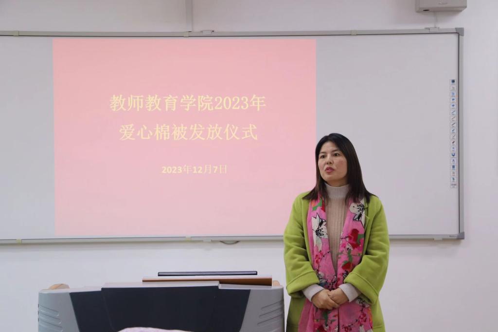 王艳蕊提到,爱心棉被的发放是学校“资助育人”工作的具体落实,她表示同学们不要害怕困难,在学校与学院的资助保障下要专心学习,努力成长成才,不断充实提高自己的能力,为将来成为一名优秀的小学教师努力奋斗,将来回馈学校与学院的关心和爱护,为学院的建设贡献自己的力量。仪式开始后,老师们为同学们一一送上爱心棉被,叮嘱大家冬季注意保暖,预防感冒。