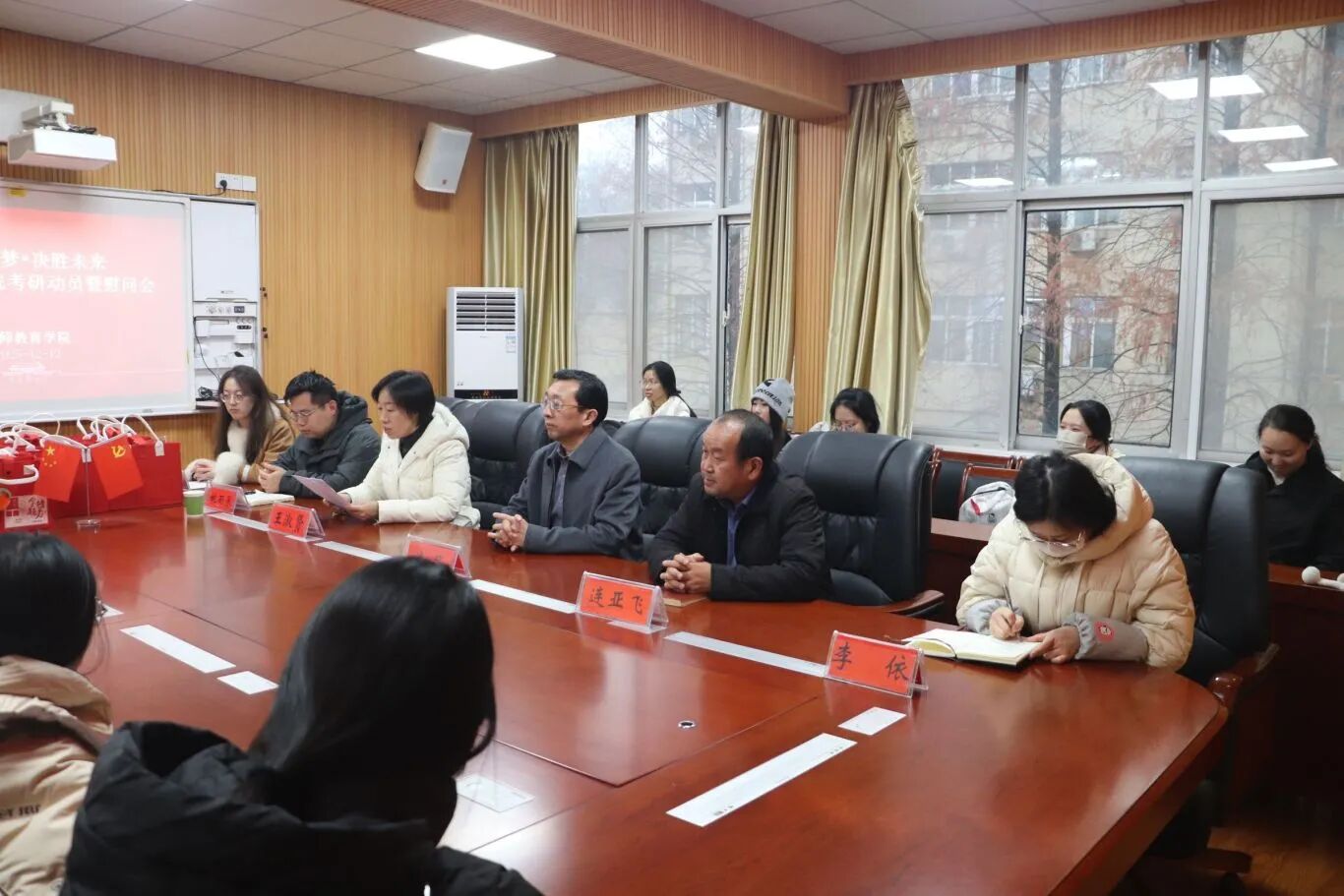 研途逐梦正当时,暖心护航伴我行。临近2026年全国硕士研究生招生考试,为帮助备考学子缓解焦虑情绪、明晰冲刺方向、凝聚奋进力量,12月12日,beat365中文官方网站在教七楼301会议室隆重举行“研途逐梦 决胜未来”考研暖心慰问会。学院党委书记潘登、党委副书记王淑贤、副院长连亚飞,辅导员姚雨承、李依、李珂及21级考研学子共同参与此次活动。
