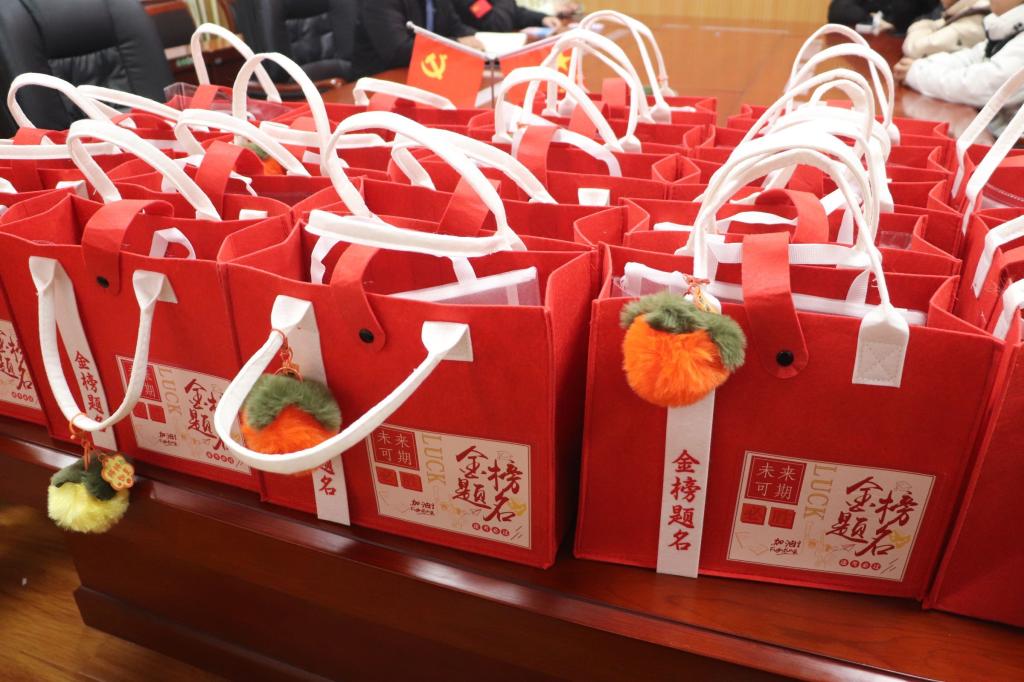 活动尾声,学院领导班子为每位备考学子精心准备了满载关怀与祝福的“考研加油包”,并与大家亲切交流,句句嘱托饱含着对学子们“一战成硕、金榜题名”的热切期盼。考研加油包里的橙子取“橙”字谐音,寄寓心想事成;苹果则以“平”字寓意平步青云,盼学子考研一路顺遂、成功上岸。草本润眼蒸汽眼罩能舒缓长期备考的眼部疲劳,考研专用答题笔等文具,都是考场作答的刚需工具,还有印着“金榜题名”“一研为定”的卡片与祝福零食,让学子在寒冬备考中,既能得到实际的备考支持,又能感受到学院浓浓的关怀与殷切期盼。