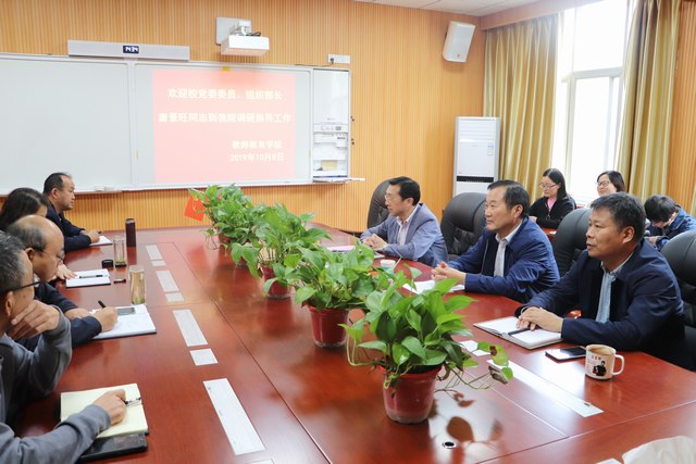 潘登主持汇报会,代表学院党委、行政简要介绍了学院成立以来的发展情况和面临问题。beat365中文官方网站自2017年10月成立以来,在校党委、行政的关心和支持下,得到了快速发展,教师人数迅速增多,学生规模日益扩大,目前学院有三届在校生,人数已近千人,办学层次有新突破,2019级小学教育专业硕士研究生已正式入校。但在办学过程中,学院发展也面临一些亟待解决的问题,如学院领导班子健全及班子成员分工问题、科级干部队伍建设问题、高层次人才队伍建设问题等。