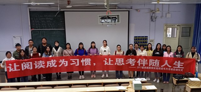 用最静心的阅读,填充求知的心灵。11月9日,2017级卓越教师实验班在教六楼102教室举行“让阅读成为习惯,让思考伴随人生”读书月活动启动仪式,实验班同学共同参加了启动仪式。