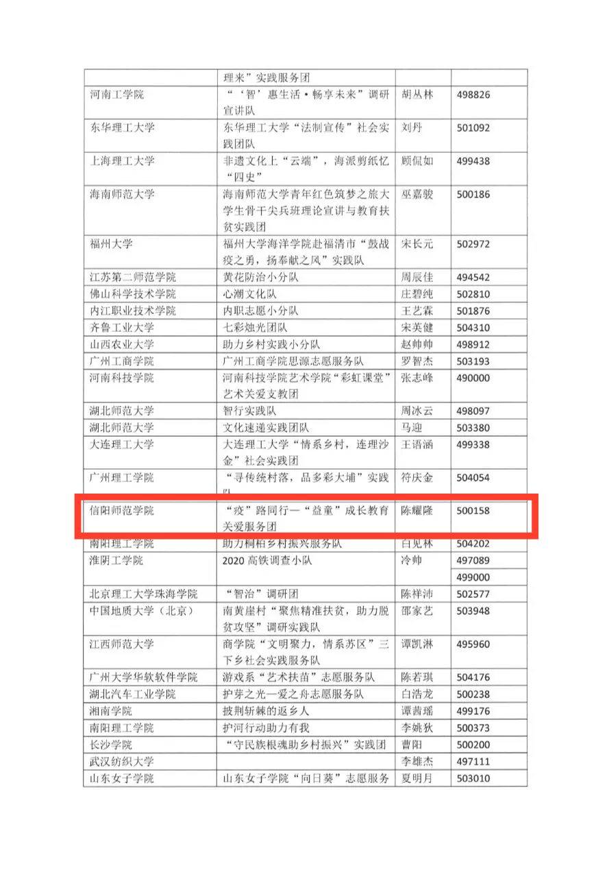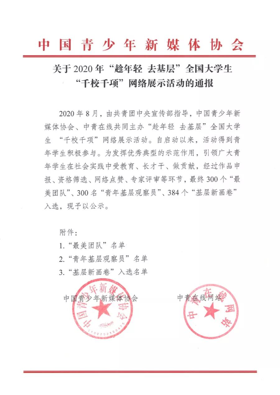 11月13日,由共青团中央宣传部指导,中国青少年新媒体协会、中青在线共同主办的“趁年轻 去基层”全国大学生“千校千项”网络展示活动经过作品申报、资格筛查、网络点赞、专家评审等环节,公示了“最美团队”、“青年基层观察员”、“基层新画卷”入选名单,beat365官网“‘疫’路同行,‘益童’成长”教育关爱服务团作品和南开大学,南京师范大学等300余所高校共同入选,其中,“‘疫’路同行,‘益童’成长”教育关爱服务团入选“千校千项”基层新画卷,服务团成员陈耀隆入选“千校千项”青年基层观察员。