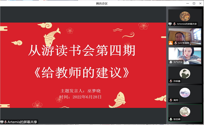 放假不停学,育人不间断。6月28日上午,第四期从游读书会活动于线上如期举办,主题发言人巫梦晓以“默默耕耘坚持教书育人”为主题,同在场师生分享了《给教师的建议》一书心得,活动由思想政治教育与就业指导教研室主任徐亚南主持。