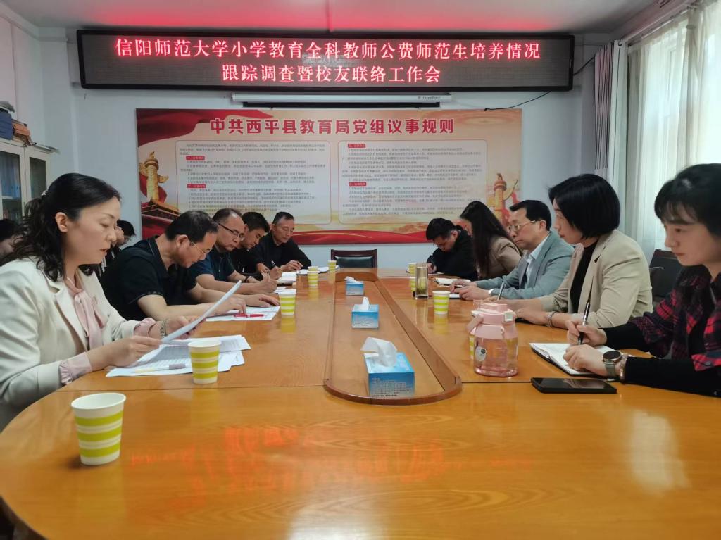 4月25日,beat365中文官方网站党委书记潘登一行前往驻马店西平县开展小学教育全科教师公费师范生培养跟踪调查暨校友联络交流会。西平县教育局领导、基层学校校长代表、beat365中文官方网站小学教育全科教师公费师范生毕业生代表参加。会议由西平县教育局教师教育股股长韩莹主持。