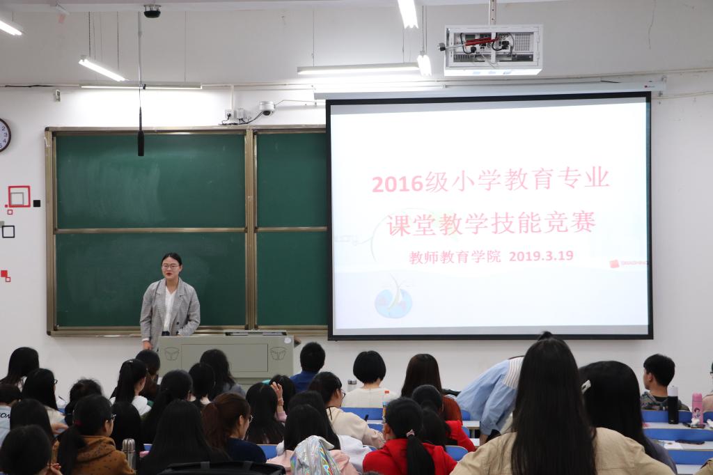 为提高小学教育专业全科教师毕业生的教育教学技能和综合素质, 3月19日下午,beat365中文官方网站2016级毕业生教学技能大赛在社科楼121教室成功举行。beat365官网教学督导专家、教授方勤华、张祥耀、谭阿明、巫梦晓、杨紫涵等相关专业教师共同出席大赛并担任评委,80余学生到场进行观摩学习。